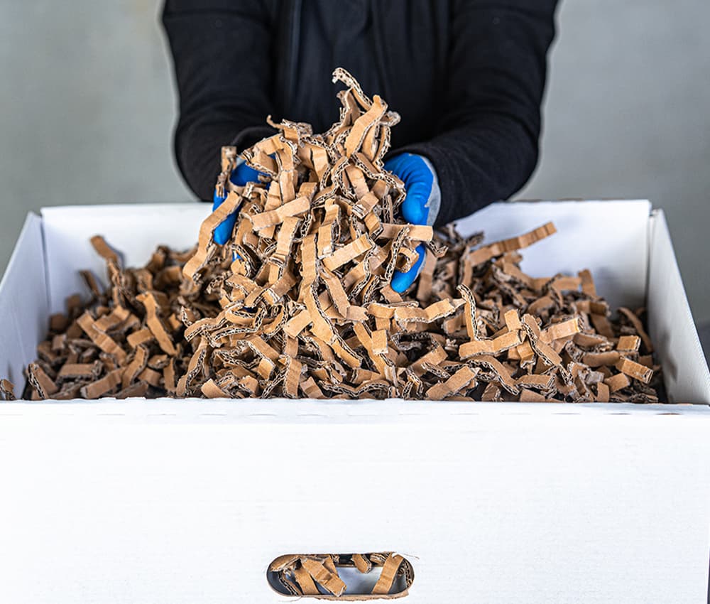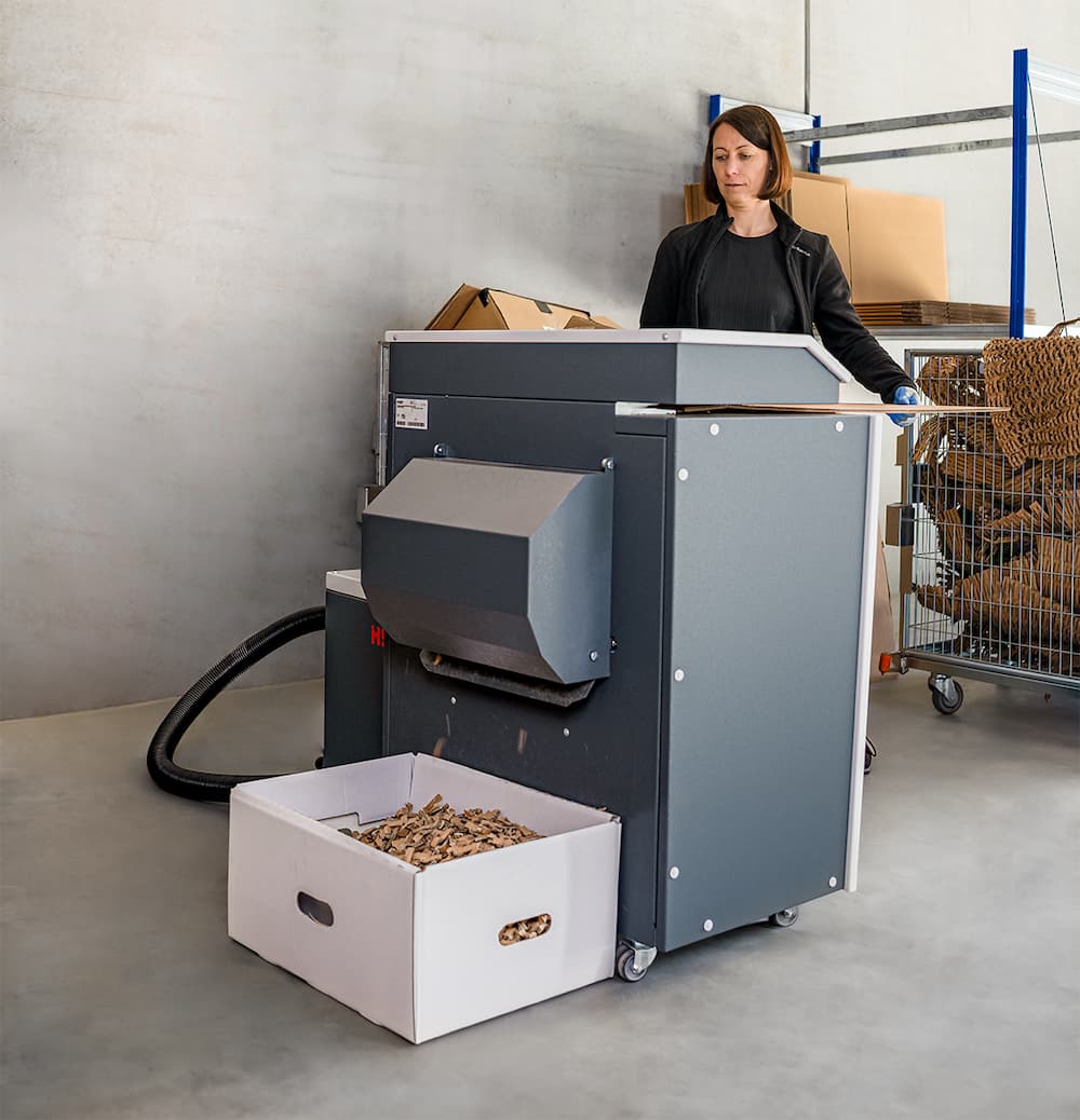 製作用於包裝和填充材料的紙板碎片。紙板碎片可以穩定包裝內的貨物,填充空隙並緩衝衝擊力——而且無需使用塑膠。