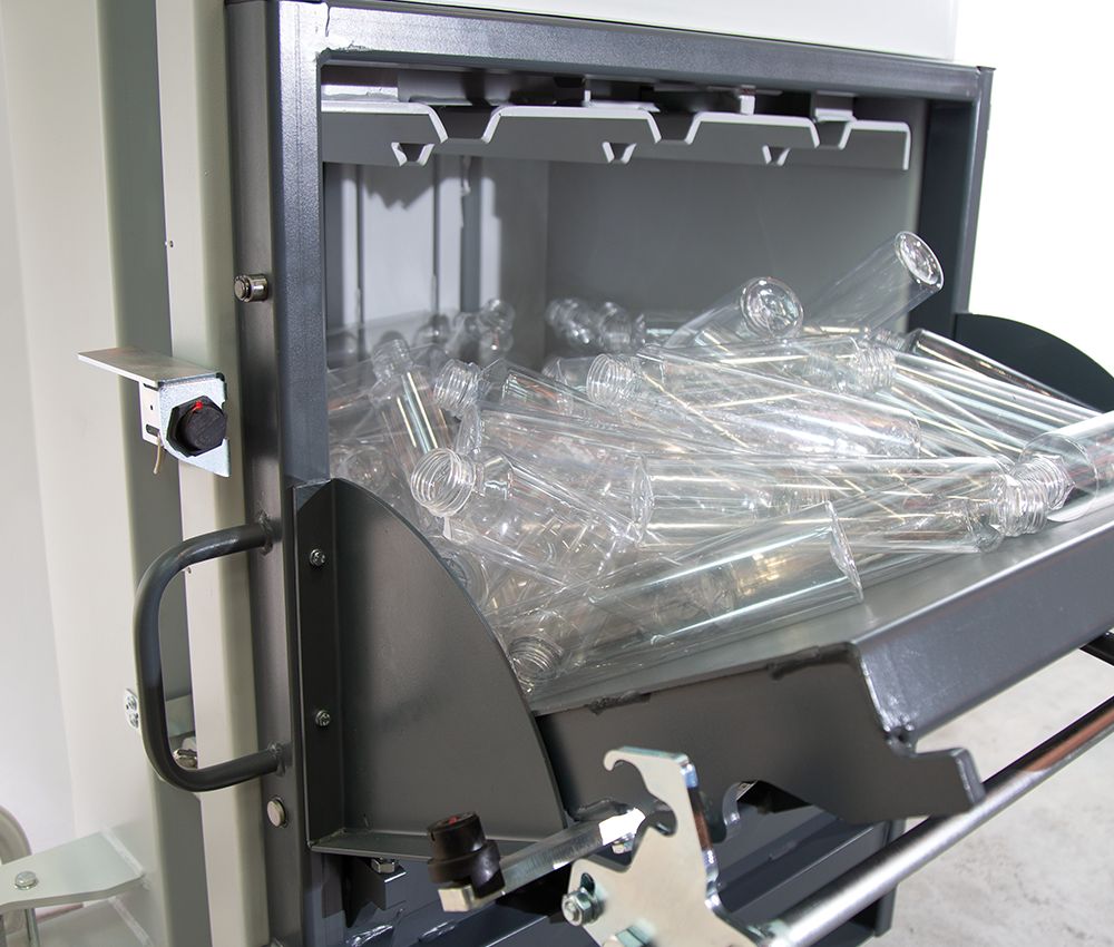HSM V-Press 610直立式廢棄物壓縮打包機專為壓縮開口或穿孔的 PET/UBC 瓶和飲料罐而設計。