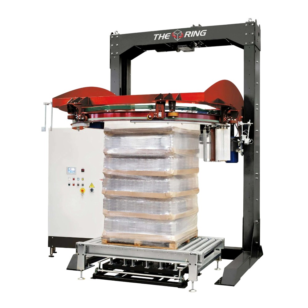 商品編號:RING(圓環)裹膜機PKG RING 是一款全自動軌道式纏繞包裝機,適用於高產能、24 小時連續作業的生產線。 RING 配備預拉伸系統,可實現 160% 至 300% 的薄膜拉伸率調節,從而能夠靈活相容於各種不同硬度的薄膜。該機器還可選配雙薄膜輸送裝置。最高速度下,每小時可纏繞多達 140 個托盤。它適用於飲料、包裝、食品等眾多高產能產業。