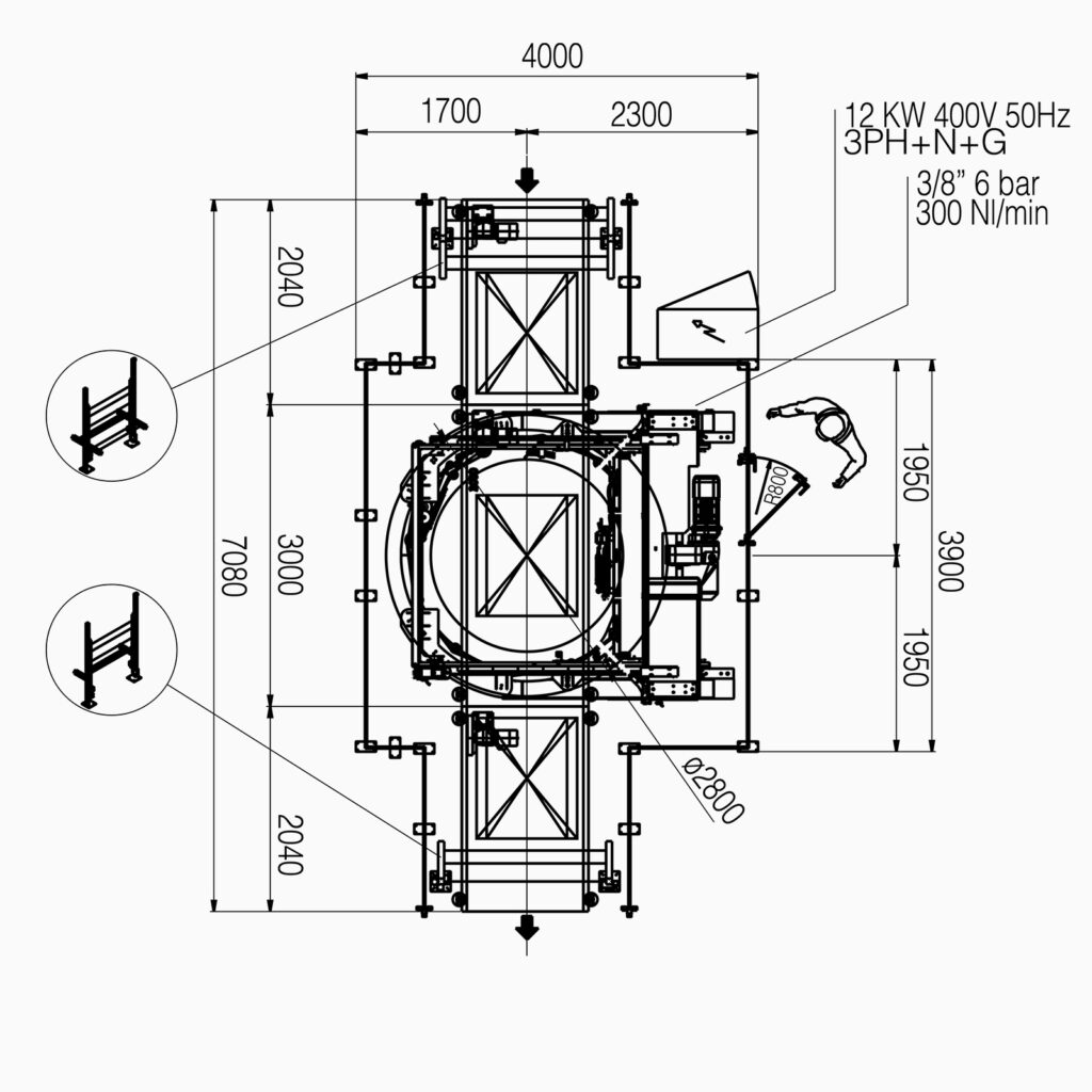 RING 自動輸送帶環式裹膜機 機型 RING 貨物尺寸 1200 x 1200 mm 包裝高度 2200 mm 最大旋轉速度 70 RPM (每分鐘 70 轉) 工作高度 450-550 mm (輸送帶或底座離地高度) 預拉伸比例 最小 160% 至 最大 300% 總裝機功率 12 Kw 標準供電規格 380V / 60 Hz — 三相五線 (3PH + N + G) 設備防護等級 IP54 (防塵、防濺水設計) 工作氣壓 6 bar