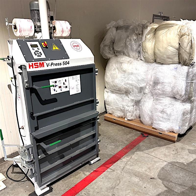 承如圖片畫面右側所示,這台高效能的設備能將原本體積龐大、雜亂無章的廢棄拉伸膜(及紙箱),強力壓縮成緊實、方正且整齊的包塊。導入 HSM V-Press 504,不僅能立即改善現場環境整潔,更能有效縮減廢棄物體積達 90% 以上,大幅釋放寶貴的倉儲空間,並節省後續清運的頻率與成本。