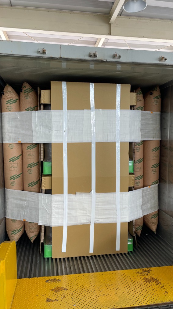 幫客人規劃利用BATES FLEX貨櫃充氣袋高耐壓、高摩擦特性,棧板單邊用2顆BATES FLEX貨櫃充氣袋來填充大縫隙,搭配TY-GARD黏貼式貨櫃捆綁帶,處理貨櫃門口開放空間,提升公司出貨品質並降低包裝成本。